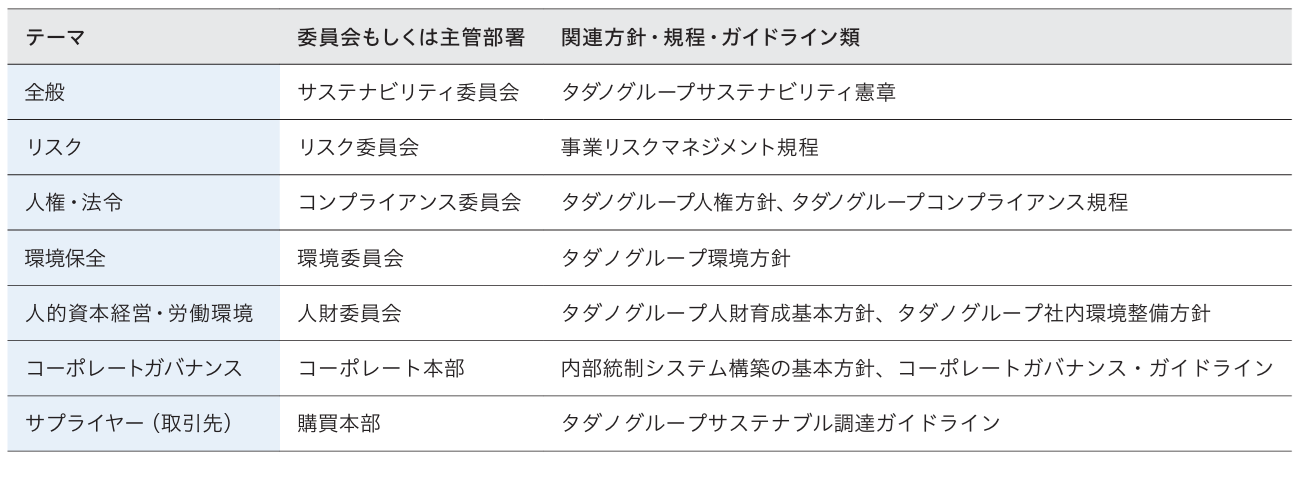 また各本部における取り組み支援等の専任部署としてサステナビリティ推進グループを総務部に設置しています。さらに「サステナビリティ委員会」の下部組織として「リスク委員会」「コンプライアンス委員会」「環境委員会」「人財委員会」の専門委員会があり、全社的なテーマについて取り組んでいます。