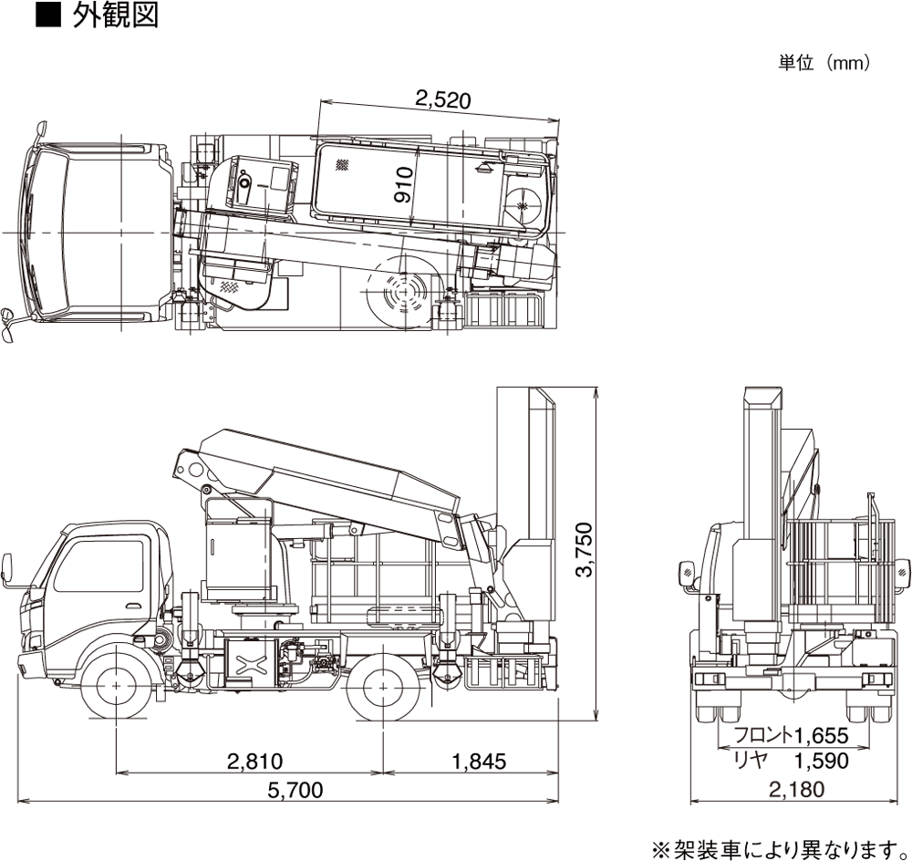 | アウトリガ | フロント | 最大張出幅 : 3.56m (タイヤ中心) 中間2張出幅 : 3.16m (タイヤ中心) 中間1張出幅 : 2.20m (タイヤ中心) |