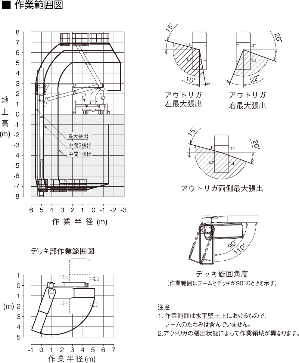 | 最大作業半径 | 5.6m (デッキ90° 旋回時) | |