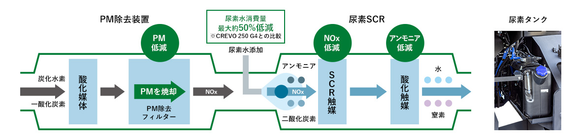 尿素SCRを組み合わせることで、効率良くNOxとPMを低減するシステムを採用。