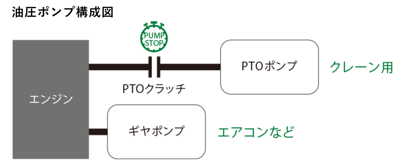 環境性能に優れたディーゼルエンジンを搭載しました。また新機能の無駄なエンジン回転を抑制する「オートアクセル」、クレーン非操作時にPTOポンプを停止する「ポンプオートストップ」でCO2排出量と燃料消費量を削減など、作業効率と環境に配慮しました。