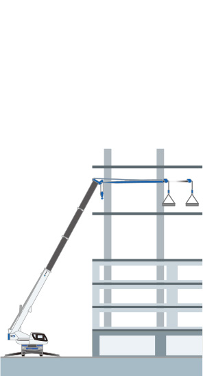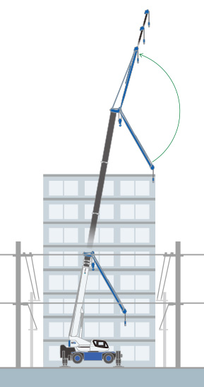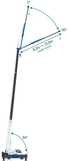 60°のジブチルトの深い懐と84°のメインブーム最大起伏角度により広範囲をサポートします。
