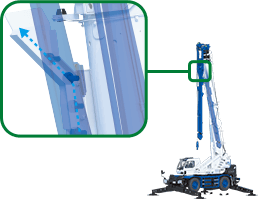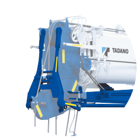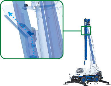 新採用のジブ・ガイドサポートが、ジブに付いているローラを誘導することにより補助ロープを使用することなく、ジブを前方に振出します。