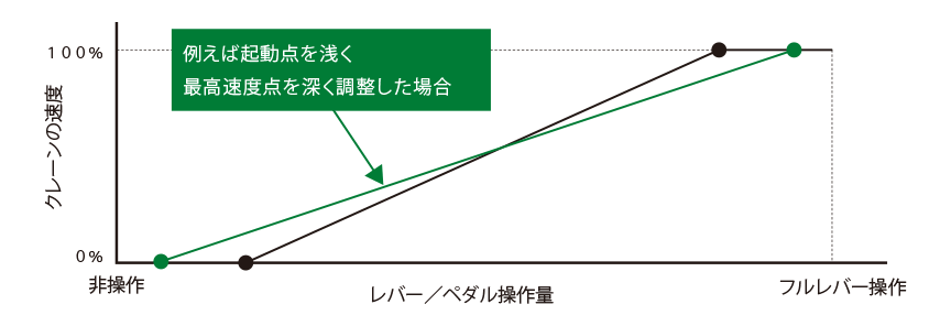 クレーンが最高速度になるときのレバー/ペダル操作量を調整できます。