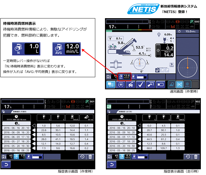 クレーン操作中の不必要なエンジン回転数を抑制。エコ・モード1では最大約30%、エコ・モード2では最大約32%ものCO2排出量削減と燃料消費量の改善を実現しています。