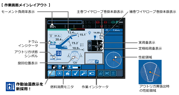 | 最大作業半径 | ブーム | 36.0m (標準性能)、 40.0m (前方特別性能) |