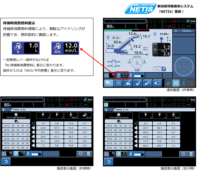 クレーン操作中の不必要なエンジン回転数を抑制。エコ・モード1では最大約22%、エコ・モード2では最大約32%ものCO2排出量削減と燃料消費量の改善を実現しています。