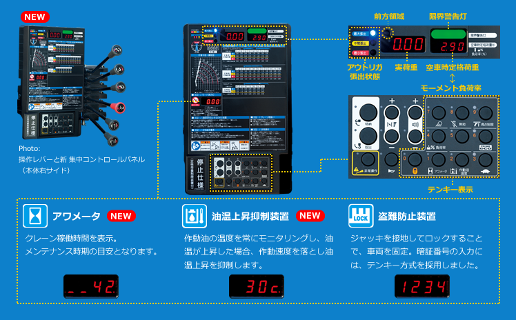上段には、実荷重や空車時定格荷重のデジタル表示機能をビルトイン。さらに限界警告灯やアウトリガ張出状態表示灯も搭載しています。また空車時定格総荷重表、作業半径-揚程図も表示し、下段には各機能スイッチ類を集約しています。